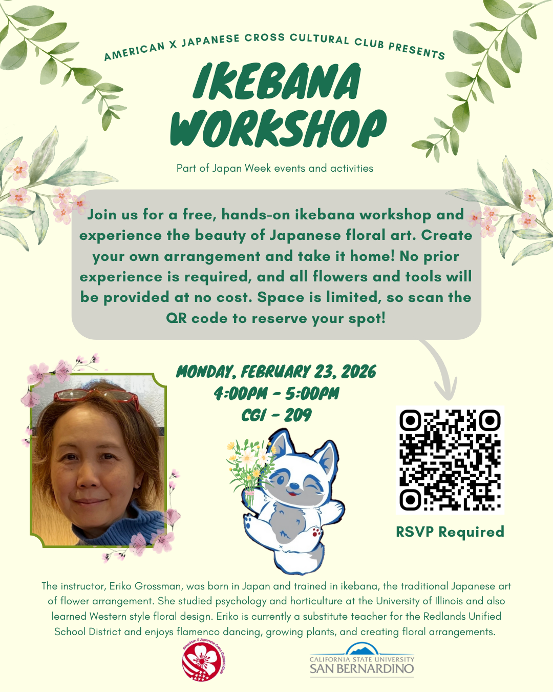 Join us for a free, hands-on ikebana workshop and experience the beauty of Japanese floral art. Create your own arrangement and take it home! No prior experience is required, and all flowers and tools will be provided at no cost. Space is limited, so scan the QR code to reserve your spot!