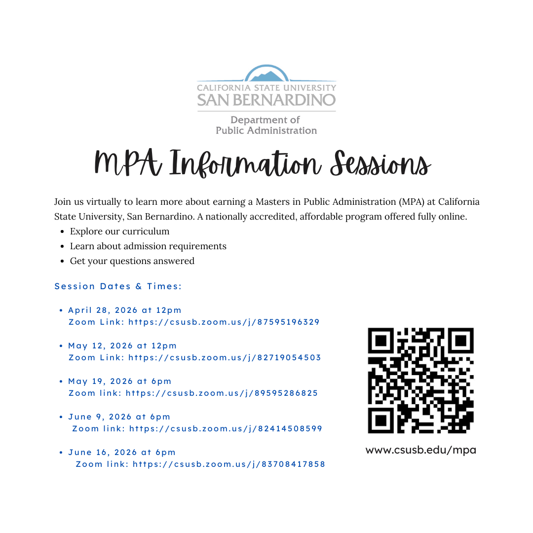 Join us virtually to learn more about earning a Masters in Public Administration (MPA) at California State University, San Bernardino. A nationally accredited, affordable program offered fully online.