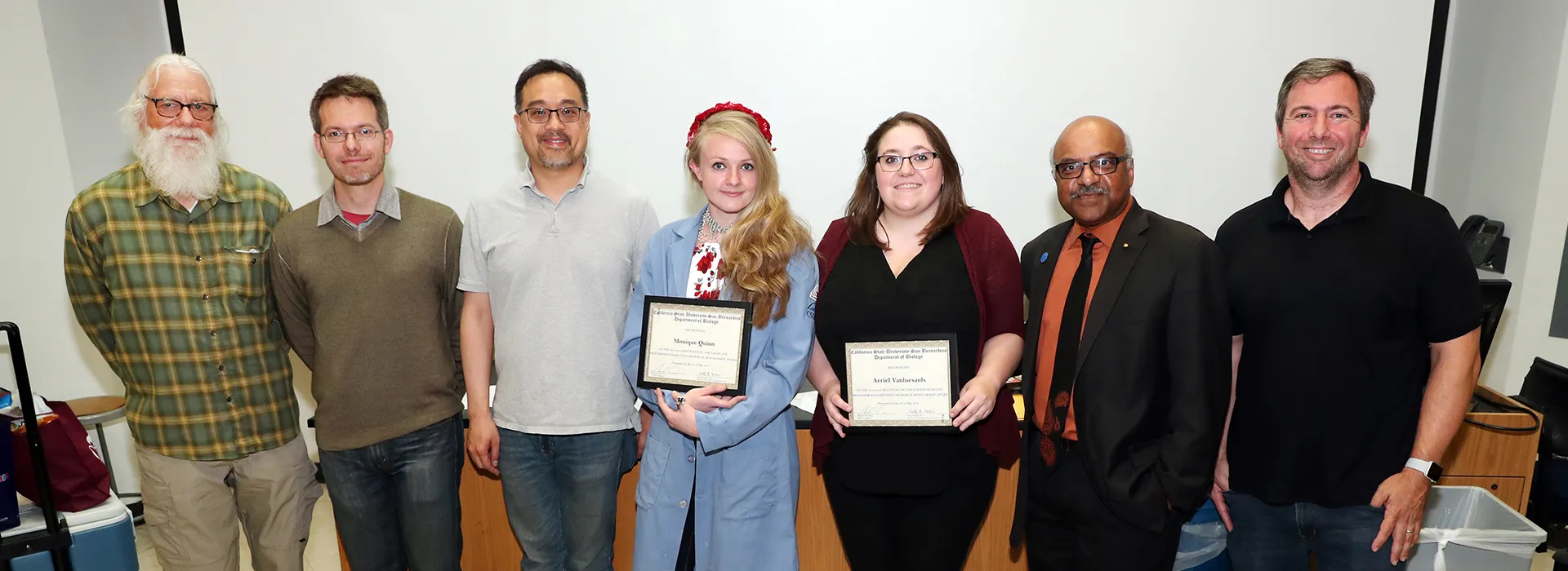 In the photo above, from left: Anthony Metcalf, professor of biological sciences; Daniel Nickerson, assistant professor of biological sciences; Mike Chao, department chair of biological sciences; Monique Quinn, biology graduate student; Aeriel Vanluesauls, undergraduate biology student; Sastry Pantula, dean, College of Natural Sciences; and Paul Orwin, professor of biological sciences. Photo: Corinne McCurdy/CSUSBMonique Quinn, Cal State San Bernardino graduate biology student, and Aeriel Vanluesauls, undergraduate biology student, were named the recipients of the Professor Richard Fehn Memorial Scholarship. Both were honored before a biology seminar featuring CSUSB alumna and former student of Richard Fehn, Stacey Nerkowski, on May 10. This is the first year two scholarship winners have been selected. “The purpose of this award is to recognize students who have done outstanding research as an undergraduate student or graduate student in memory of Professor Richard Fehn, who was a former faculty member here who highly valued student research in the department,” said Mike Chao, professor and department chair of the biological sciences department. Quinn and Vanluesauls each received a plaque during the ceremony. Their names were also included on a plaque that hangs in the biology building. Quinn, who also received her undergraduate degree in biology from CSUSB, began her research journey studying yeast molecular biology with Daniel Nickerson, assistant professor of biology, as her major adviser for her master’s thesis. “I love doing research with yeast and with microscopy, and there are a bunch of parts that are fantastic, but my favorite would probably be when I encounter results that are unexpected. Even though it means I was incorrect initially, it always gives me the opportunity to learn more about my research and grow as a research scientist,” Quinn said. “I also really love working in microscopy. I have been able to use the fluorescence microscope in my own lab and the College of Natural Sciences scanning electron microscope, and both are fun for me to use.” “Monique is a talented, curious, self-motivated, hard-working and delightful scholar, certainly among the most consistently excellent students in her cohort of CSUSB biology majors, and now one of the strongest in her graduate cohort,” Nickerson said in his nomination letter. “Monique joined my lab as a master’s student almost two years ago, and serving as her mentor is one of the luckiest opportunities I have had. Monique has been cheerfully dedicated to her training and advancing her research project while also growing into a strong mentor and research team leader. Monique is an embodiment of the joy in research and high standards set by the Fehn Award.” Quinn plans on pursuing her doctorate in either molecular biology or in microscopy.Vanluesauls started researching in Paul Orwin’s laboratory, professor of biological sciences, where she studied antimicrobial compound production in bacteria. “This is a fairly advanced topic in biochemistry, but she proved quite capable of engaging with this material,” Orwin said in his nomination letter. “At the end of the directed reading experience, Aeriel produced a term paper that is written comparably to the literature reviews that I read as a graduate mentor. Her ability to digest, understand, and synthesize the information in primary literature was notable compared to her undergraduate peers.” “I just really love being in the lab!” Vanluesauls said. “Doing an experiment, collecting the data and finding something significant is really exciting. It’s always really cool to be able to contribute to the larger pool of human knowledge.” Vanluesauls plans to pursue a doctorate in microbiology from the University of Southern California. Richard Fehn, who died in 2007, was known as a caring and dedicated instructor, and for his passion for teaching and his commitment to student research. He mentored at least 87 undergraduate and graduate students and he continued to mentor those graduates as they pursued their research, published their work and moved into fellowship positions in their fields. He also served as chair of the biology department and was named CSUSB’s Outstanding Professor in 2004. Fehn graduated from CSUSB with a bachelor’s degree in 1974 and a master’s degree in 1978, both in biology. He received his doctorate degree in animal physiology from the University of Arizona. For more information about the Professor Richard Fehn Memorial Scholarship, visit the Department of Biology’s website.