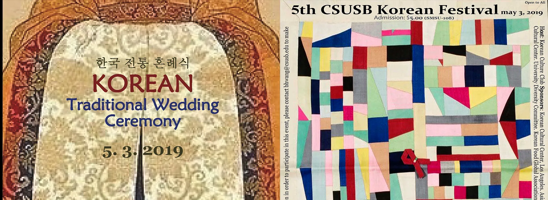 The Cal State San Bernardino Korean Culture Club will host the fifth annual Korean Festival on Friday, May 3, at the Santos Manuel Student Union, featuring a traditional wedding ceremony, dinner reception and performance showcase. Admission is required for the dinner reception and performance showcase. The wedding ceremony is free. Tickets are available at the SMSU Box Office (SMSU-108) and are $5 (cash only). The traditional Korean wedding ceremony, Holyesik, will be from 3:30 to 4:30 p.m. in the SMSU Events Center. Following the ceremony, from 5 to 6 p.m. in the SMSU Events Center, guests will be able to try various Korean dishes prepared by 10 Korean chefs. The performance showcase will take place 6:30 to 8 p.m. in the SMSU Theater and will feature performers in both modern and traditional Korean themes. Sponsors of the event include the Korean Cultural Center, Los Angeles; Asian Faculty, Staff and Student Association; Cross Cultural Center; University Diversity Committee; Korean Food Global Association; and the Department of World Languages and Literatures. For accommodations, contact Bomi Hwang, lecturer in the world languages and literatures department, at bhwang@csusb.edu.