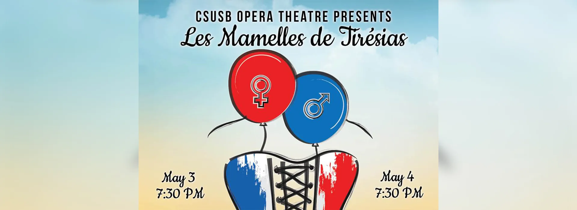 “Les Mamelles de Tirésias” (The Breasts of Tiresias), a comic opera by French composer Francis Poulenc, will be performed by the CSUSB Opera Theatre on Friday, May 3, and Saturday, May 4, both at 7:30 p.m., at the university’s Performing Arts Recital Hall.Written in Paris, during surrealism’s Golden Age, these absurdist delights unfold amid storylines that are as entertaining as they are strange. Inspired by the story of the Theban soothsayer Teiresias, the author inverted the myth to produce a provocative interpretation with feminist and pacifist elements. He tells the story of Thérèse, who changes her sex to obtain power among men, with the aim of changing customs, subverting the past, and establishing equality between the sexes.“Les Mamelles de Tirésias” is based on the play of the same title by French poet Guillaume Apollinaire, who is considered one of the foremost poets of the early 20th century, as well as one of the most impassioned defenders of Cubism and a forefather of Surrealism. Join the CSUSB Opera Theatre for an evening of spectacular nonsense and fun, where nothing makes sense and the bizarre is king!Tickets can be purchased online at the following link: GET TICKETS NOW. Tickets can also be purchased in person at the Performing Arts Recital Hall box office from 1-4 p.m., Monday-Friday in Room 145 in the Performing Arts Building.For more information, call the box office at (909) 537-7516.