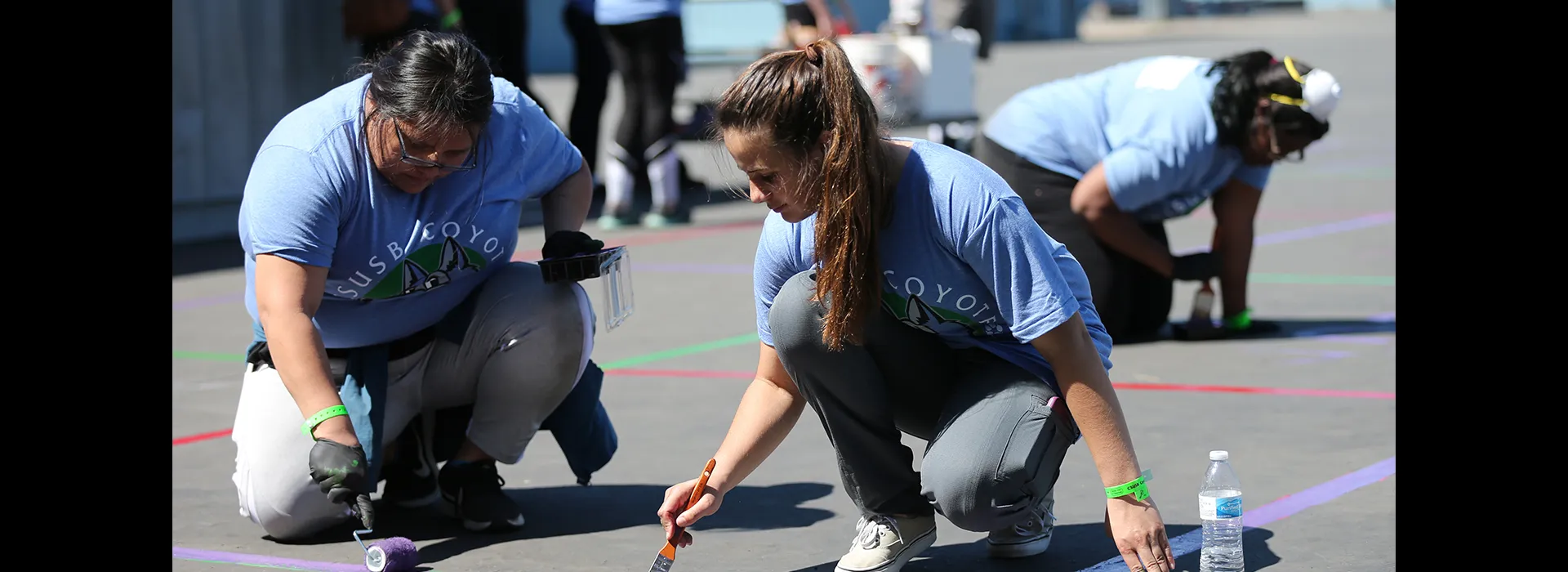 More than 420 Cal State San Bernardino students, alumni, staff and faculty joined forces as volunteers on and off campus to help local nonprofit organizations and community agencies as part of the seventh annual Coyote Cares Day on April 13. CSUSB student volunteers were shuttled in 10 school buses and 10 vans to locations throughout the area, including as Loma Linda, Colton, Redlands and San Bernardino, to help community organizations and nonprofit agencies, schools and parks do repairs, pack supplies and take care of other needs. Prior to the students being sent out to their volunteer assignments, CSUSB President Tomás D. Morales praised them for their efforts. “I want to thank you all for being here. This is so meaningful, so meaningful for you to be here,” Morales said. “To see so many clubs and organizations, so many sororities and fraternities, so many athletic teams here to give back, to give service. “We are obligated, because we are blessed to be in this university setting,” Morales said. “We are so fortunate and you are the future of this region, and so I just want to thank you. You may not realize how important your contribution is.” On campus, the volunteers served at two sites, helping at the 12th annual C.A.S.A. (Court Appointed Special Advocates for children) Heart of Hero Run, and, for the fourth straight year, CSUSB Alumni Relations partnered with the Office of Community Engagement to pack boxes for the Community Action Partnership of San Bernardino. More than 120 volunteers, most of them alumni, packed 1,700 boxes of food in less than two-and-half hours, breaking last year’s record of packing 1,500 boxes. The Community Action Partnership will distribute the food to families in need throughout San Bernardino County. Coyote Cares Day is a day of volunteer service that provides CSUSB students with an understanding of the work of nonprofit organizations, and engages the students through volunteer service. Coyote Cares Day took place at the end of National Volunteer Week, an annual celebration observed in many countries, to promote and show appreciation for volunteerism and volunteering. The participating community organizations where the volunteers served included: