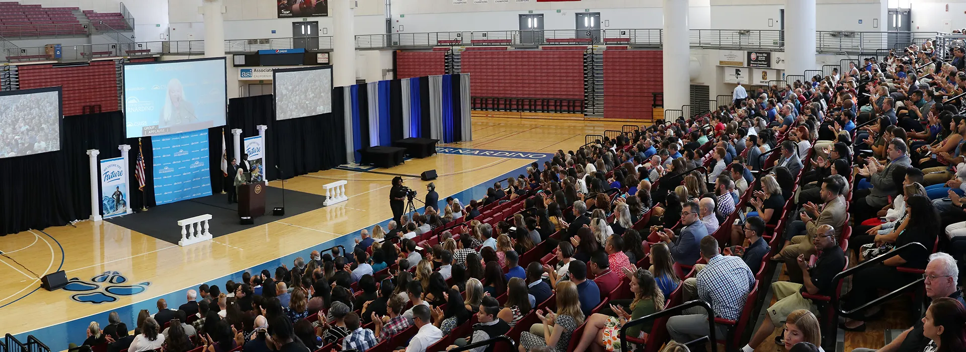 A significant increase in the university’s six-year graduation rate and achieving 97 percent of its $50 million fundraising goal two years after the public phase was launched were among the many highlights shared by Cal State San Bernardino President Tomás D. Morales during his annual Convocation address Sept. 17. The university’s effort involving the CSU Graduation Initiative 2025 is having a positive impact, Morales said to the assembled faculty and staff in Coussoulis Arena, as well as those watching the online livestream. “At the finish of the 2018 Summer Session, our four-year graduation rate was up 2 percent from the previous year,” he said. “Our two-year graduation rate, up 10 percent in the past four years, is on track to meet our 2025 target of 45 percent. Statistically, the achievement gap for our two-year grad rate is almost insignificant between underrepresented students and non-underrepresented student communities.“So, it comes as no surprise that, over the past five years, our six-year rate has jumped by 13 percent,” said Morales, who is entering his seventh year in leading the university. The university is also experiencing an unprecedented level of success in advancement and philanthropy, he said. “The university’s $50 million comprehensive campaign is already the largest single fundraising initiative in our history. As I stand here today, just two years after entering the public phase, we have surpassed $48.5 million, or 97 percent of our goal.” And, he added, “We have also acquired a record $36.1 million in external funding to support research and sponsored programs. This is a testament to the outstanding work of our faculty and staff, who bring in new and recurring grant opportunities.” Convocation marked the start of CSUSB’s 53rd year, and the event included acknowledgement of faculty and staff who were honored with accolades for their work in advancing the university. CSUSB also formally welcomed new faculty and staff, along with administrators serving interim posts: Harry Le Grande (vice president, Division of Student Affairs), Bruce Shepard (dean, Palm Desert Campus), Rueyling Chuang (dean, College of Arts & Letters), and Jake Zhu (dean, College of Education). Also recognized were those who earned degrees in the past year, as well as those whose work contributed to university. “This convocation is the starting point, a traditional gathering where we renew acquaintances, refresh our passion for education and reinforce the proud legacy of this great university,” Morales said. As he looked toward the new academic year, the president, using the university’s Strategic Plan, reflected the foundation on which it will be built. Some of the highlights: Student Success “Our students are getting excellent instruction from our exceptional faculty,” Morales said. “Many are expanding on that by taking part in study abroad programs and a wide range of internships. These opportunities give them a better understanding of our world and provide valuable experience while also building confidence. “In an effort to encourage our students to advance academically by attending summer session, $1 million was allocated for Graduation Initiative Grants. We saw an immediate impact when all but one of the 415 students awarded grants for summer 2017 qualified to graduate at the end of summer session or that fall. “Under its new name, the Undocumented Student Success Center celebrated its second anniversary with the creation of the Optima Family Services Scholarship, established by two sisters who graduated from CSUSB. Available to graduating high school seniors with a declared major within either the College of Social & Behavioral Sciences or the College of Natural Sciences, Optima scholarships are open to all, with qualifying undocumented students receiving preference.” The university has also launched two independent task forces to address trends relating to the college-going rates of its two most under-served communities: African-Americans and Native Americans, and work continues on both. Faculty and Staff Success “We received a $125,000 grant from the Chancellor’s Office to assist in diversity advocate training and implement strategies to increase faculty diversity,” the president said. “The decision to administer summer session on a self-support basis has allowed us to serve many more students, offer more courses, provide nearly $2 million in additional faculty pay, offer an extra $2 million in student financial aid, and distribute more than $650,000 to academic colleges and departments. “Last year saw the creation of Staff Council, a significant addition to shared governance. Dedicated to serving CSUSB, Staff Council is advancing professional development opportunities for those who serve as the backbone of our university. “We also dedicated two central resources for faculty and staff success at CSUSB. The Staff Development Center and the Faculty Center for Excellence are celebrating one-year anniversaries.” Resource Sustainability and Expansion “The university’s master plans for both campuses received approval from the CSU Board of Trustees,” Morales said. “We also released a draft of our Resilient Sustainability Plan, which provides a guideline for both campuses in an effort to reduce the university’s carbon footprint. “ITS, in collaboration with the CSU Chancellor’s Office, oversaw an upgrade of our university’s internet connectivity speed. A 100-gigabyte link to the California Research & Education Network will greatly develop capacity and allow for academic research previously unavailable to our faculty and their students.” Community Engagement and Partnerships “The Office of Community Engagement was again amazingly active throughout the year,” the president said. “From another successful Coyote Cares Day to coordinating service and volunteer hours, it worked closely with student clubs and organizations, 
