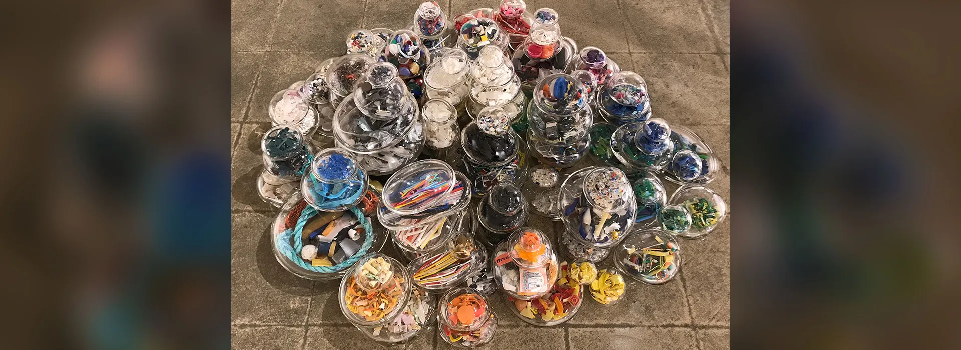 Conner’s work is inspired by biological forms and the disciplines of archeology, geology and anthropology. “Plasticozoic” combines glass with plastic marine debris, including crystalized plastic specimens; 111 (for the years since plastic was invented) glass rock forms filled with plastic she collected and sorted over a two-year span from along the California coast; and bottles containing marine plastic sent to her by participants from around the U.S. and across the world.