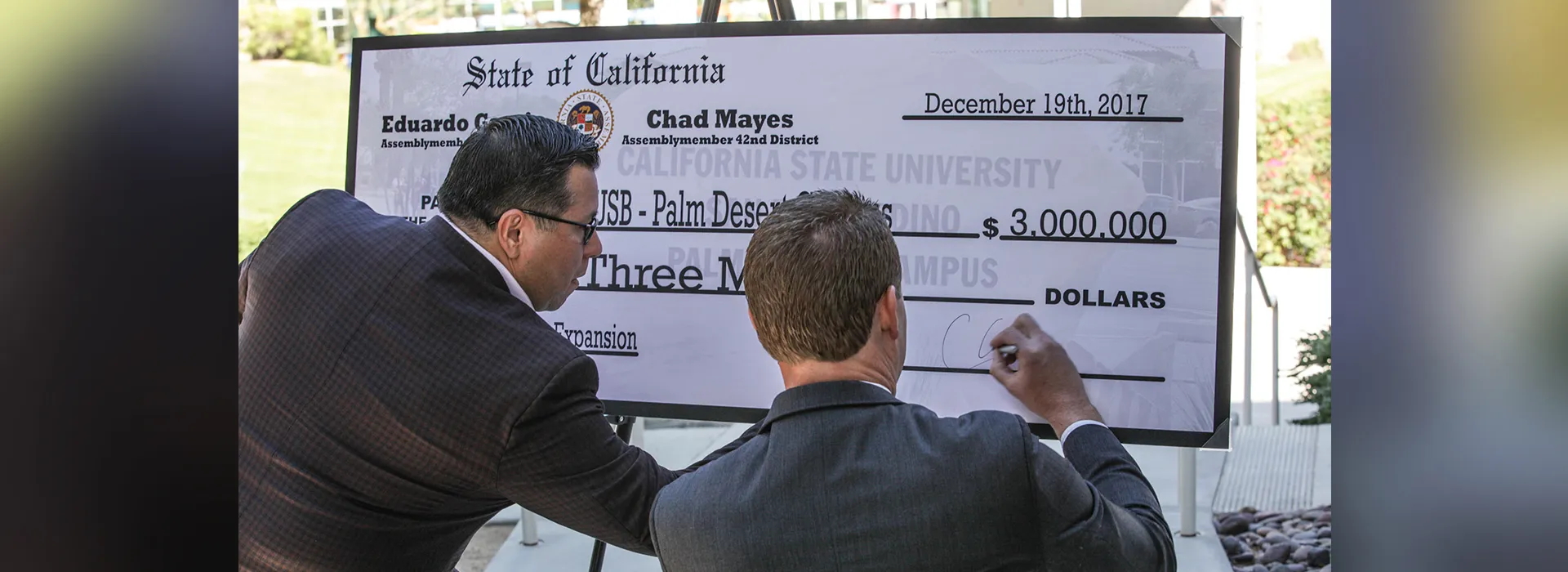 State Assembly members Chad Mayes (R-Yucca Valley) and Eduardo Garcia (D-Coachella), who stewarded the request for direct funding to the Cal State San Bernardino Palm Desert Campus last spring, formally presented the state’s $3 million commitment to the campus during a ceremony on Tuesday, Dec. 19.
