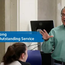 Tom Long was the recipient of the surprise announcement on Thursday when CSUSB President Tomás D. Morales led a group of about 30 faculty, staff and administrators to congratulate Long with the news during one of his classes.