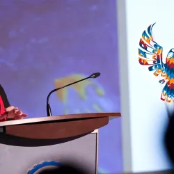 Charlene Teters took the audience on an audio and visual journey when she discussed her experiences as a child, student, parent, artist and activist protesting the use of Native Americans as sports mascots.