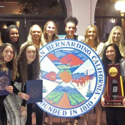 The team received a standing ovation as San Bernardino Mayor John Valdivia praised the team for their winning the 2019 NCAA Division II national championship.