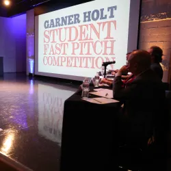A student makes a presentation at the 2019 Garner Holt Student Fast Pitch Competition.