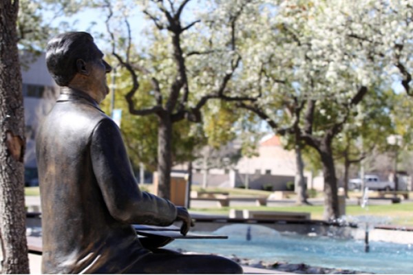This landmark, the Legacy Fountain, was revealed on September 20, 2015. As part of CSUSB's 50th anniversary festivities, bronze statues of our prior three presidents were dedicated on campus. Each president faces a portion of campus that was noteworthy during their tenure.