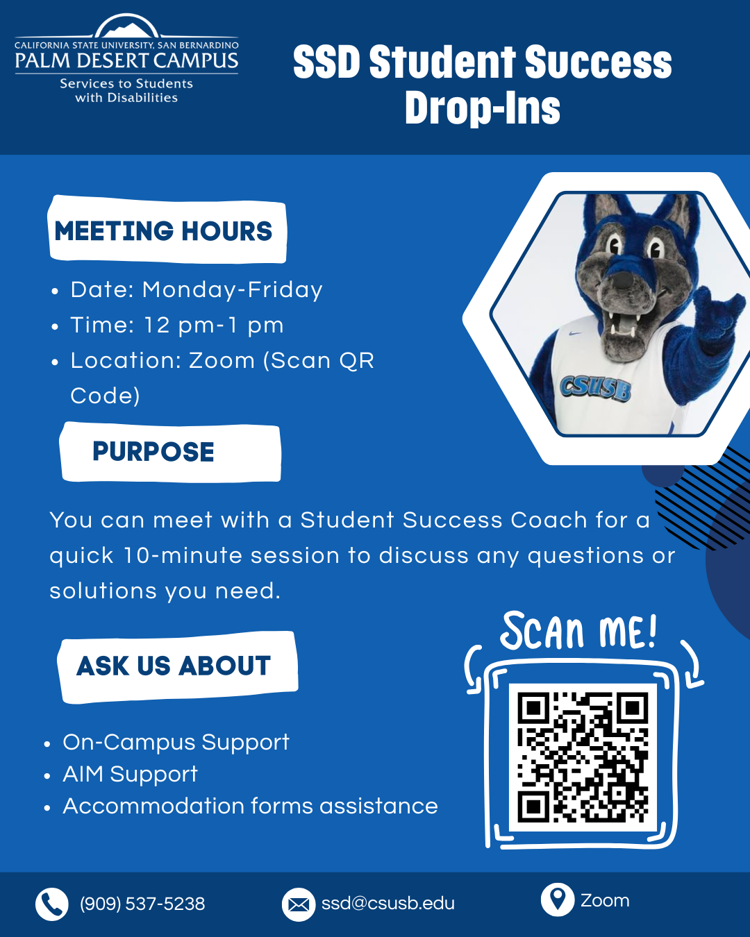 The Office of Services to Students with Disabilities (SSD) is committed to providing eligible students accommodations that ensure equal access to learning and equal opportunity for academic success. SSD also works with its student advisory board as well as CSUSB faculty and staff to raise campus-wide awareness of issues related to disability, accessibility, and equity.